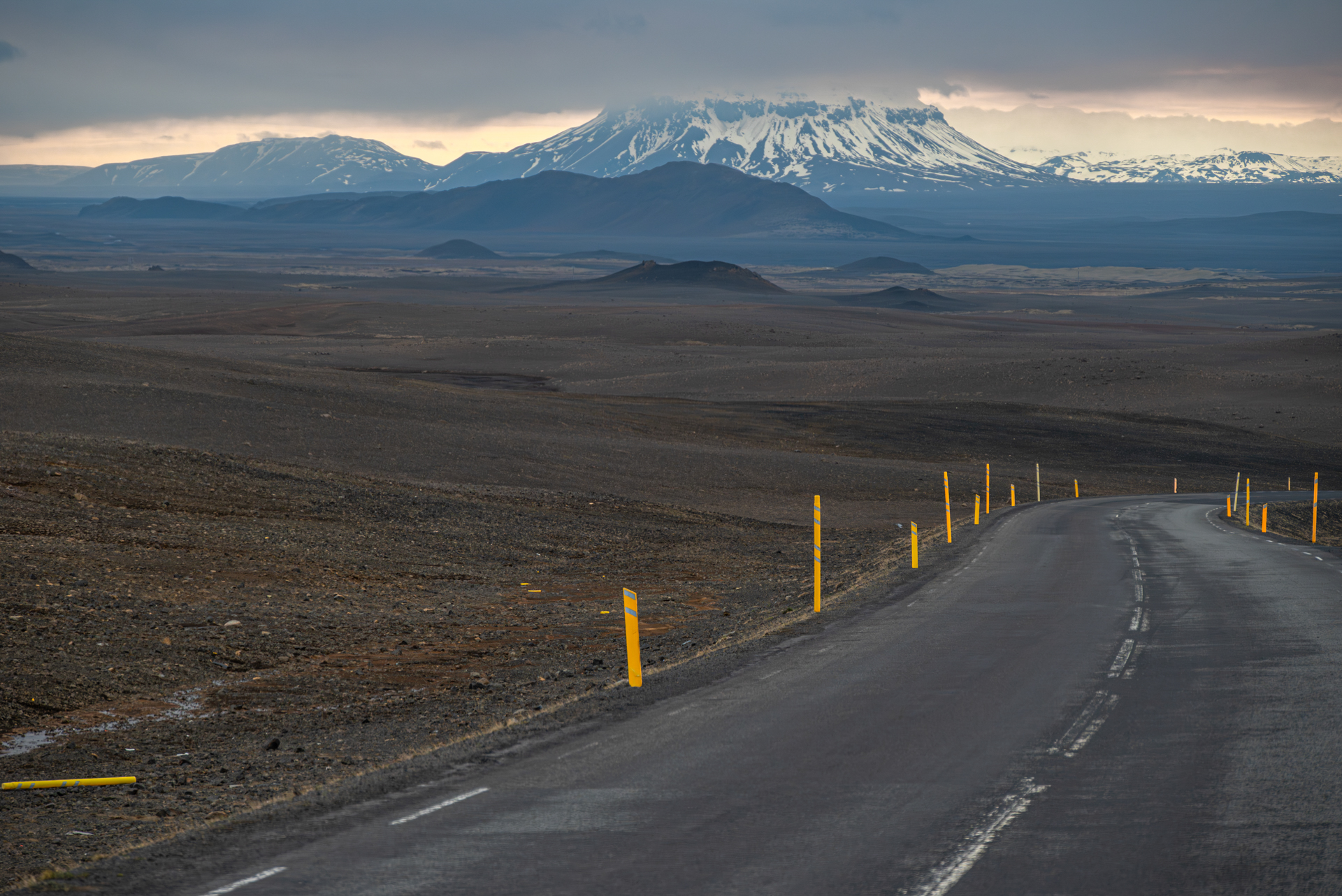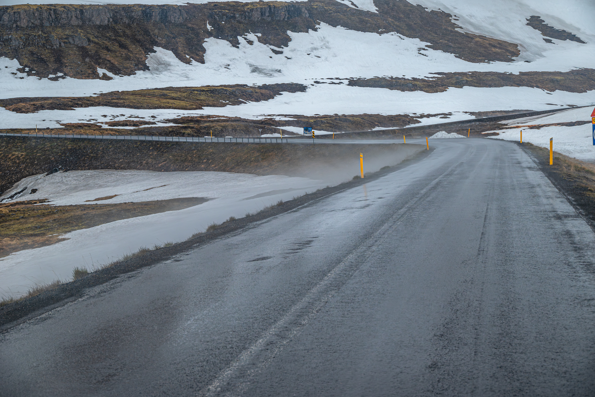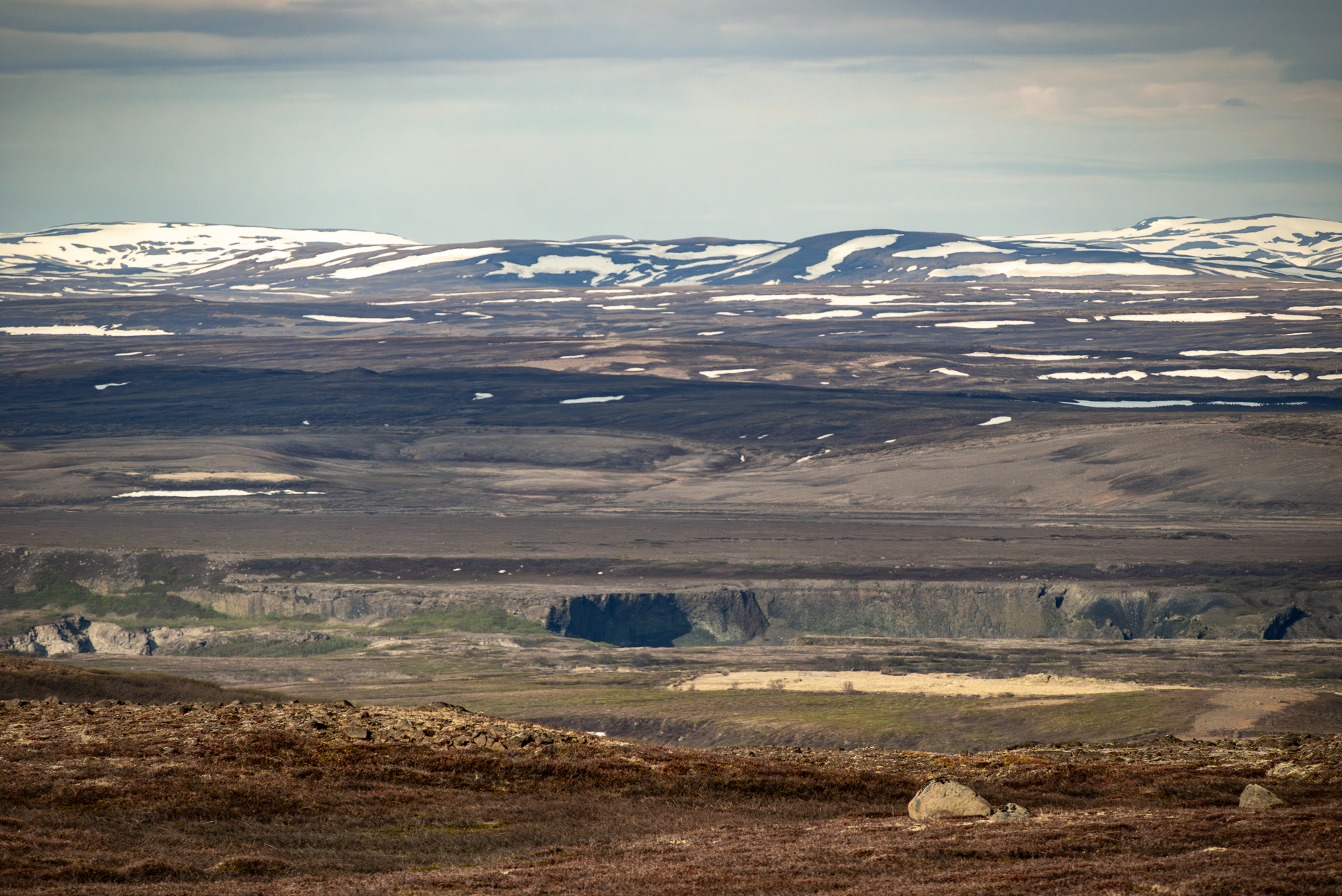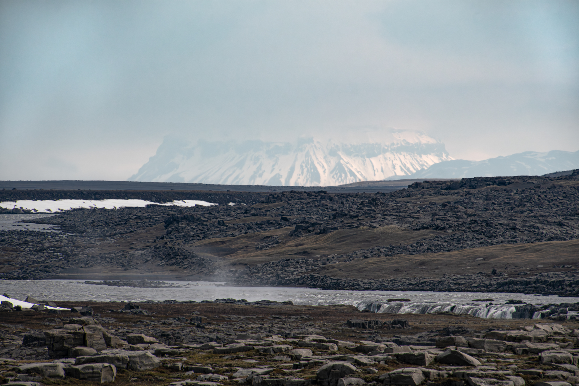 De weg 862 naar Dettifoss loopt langs een desolaat landschap met nog veel sneeuwresten.