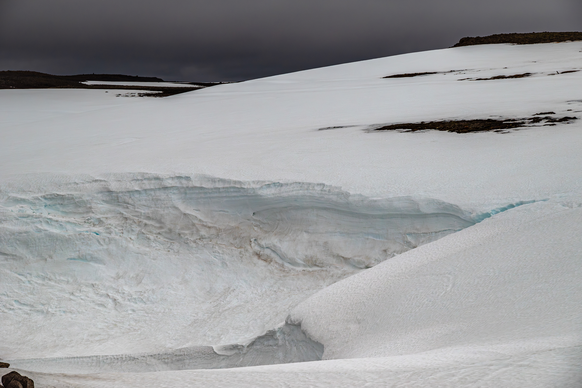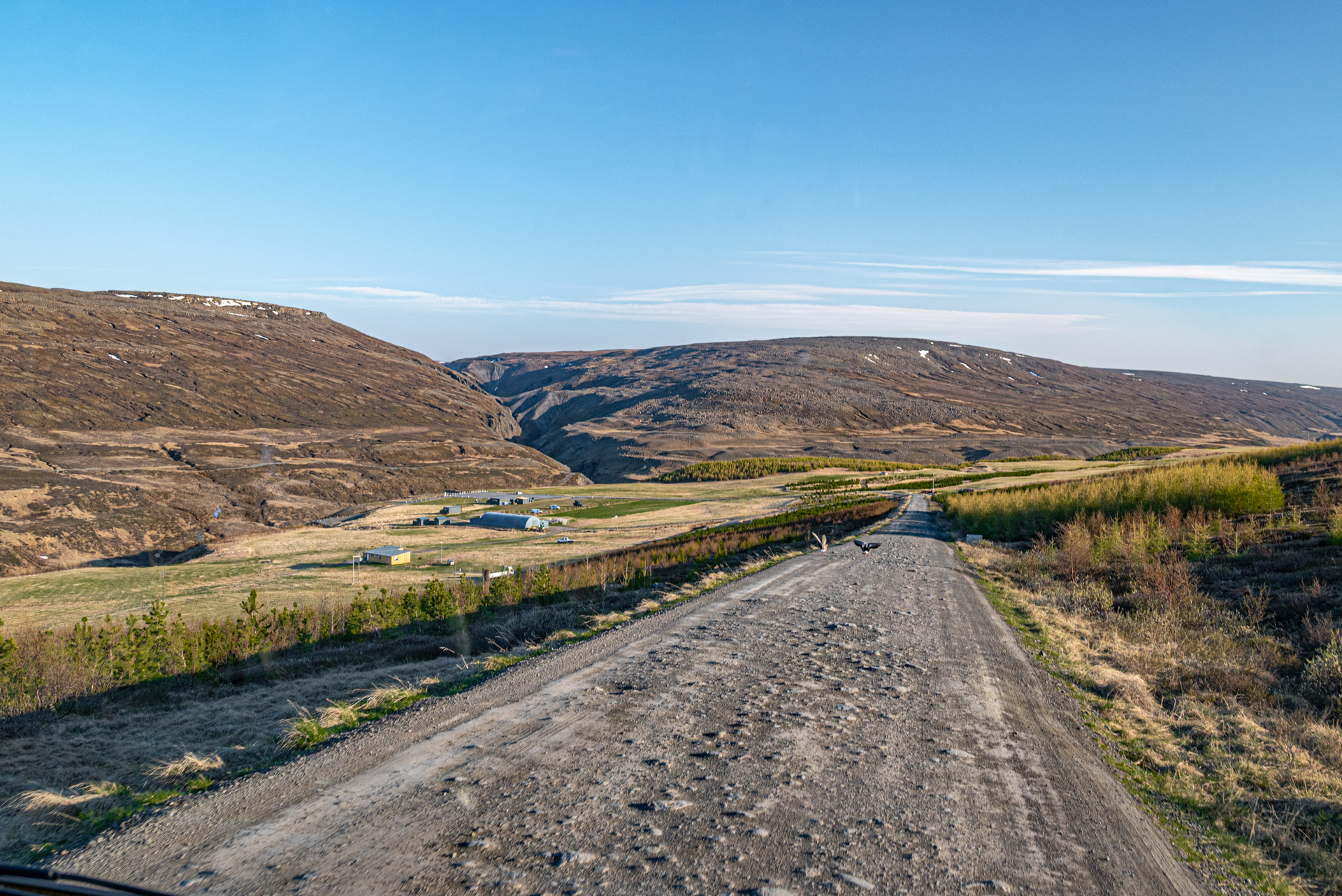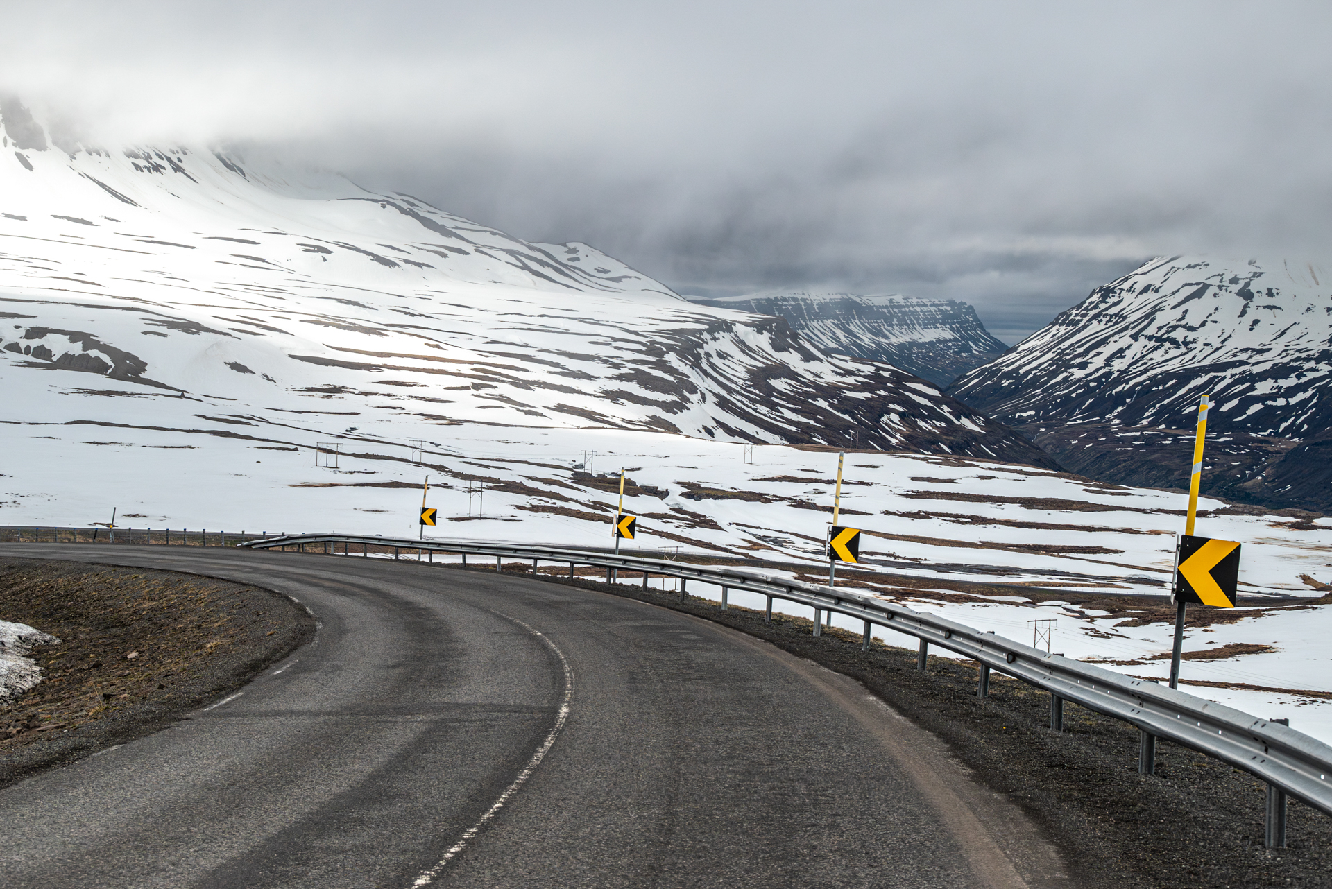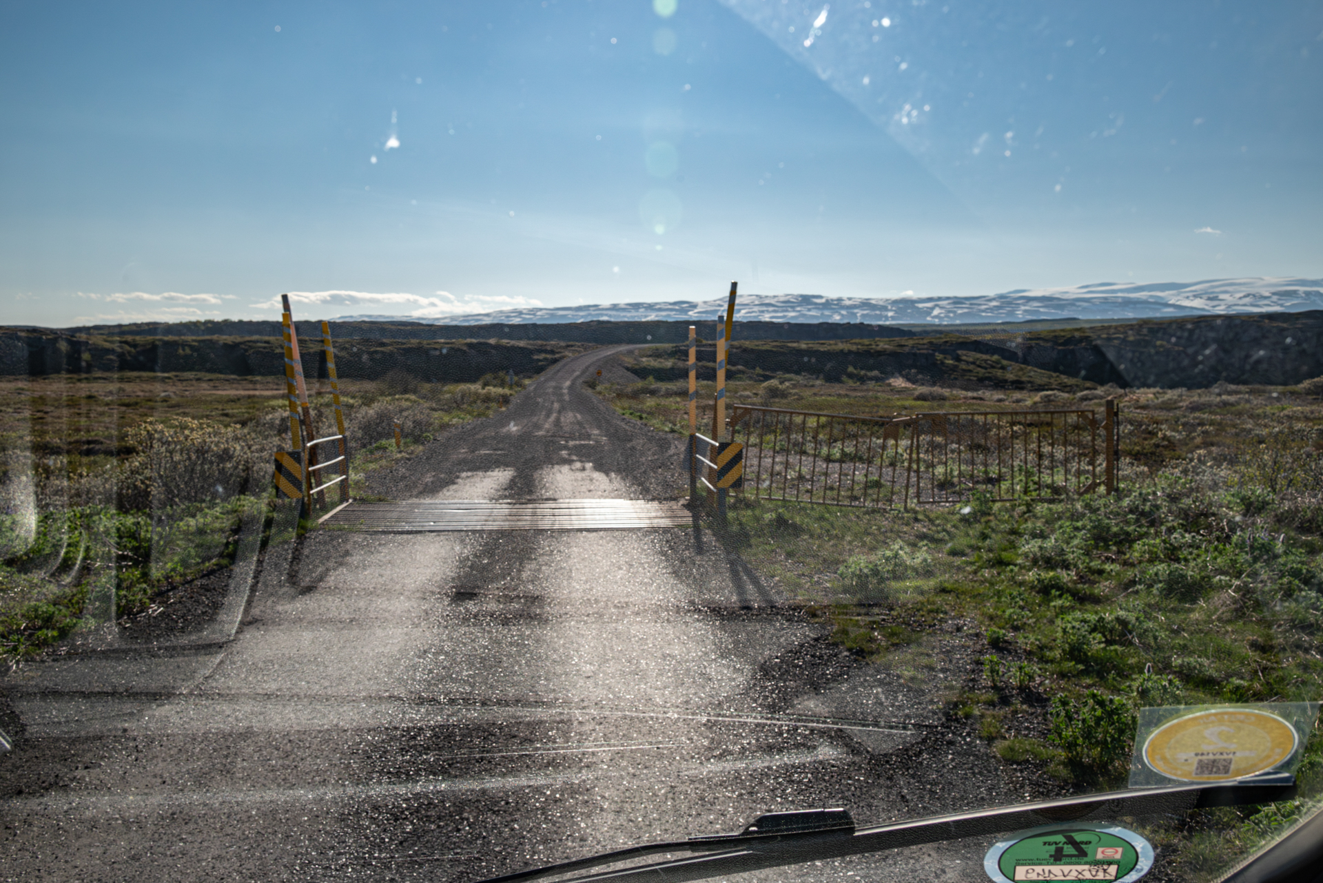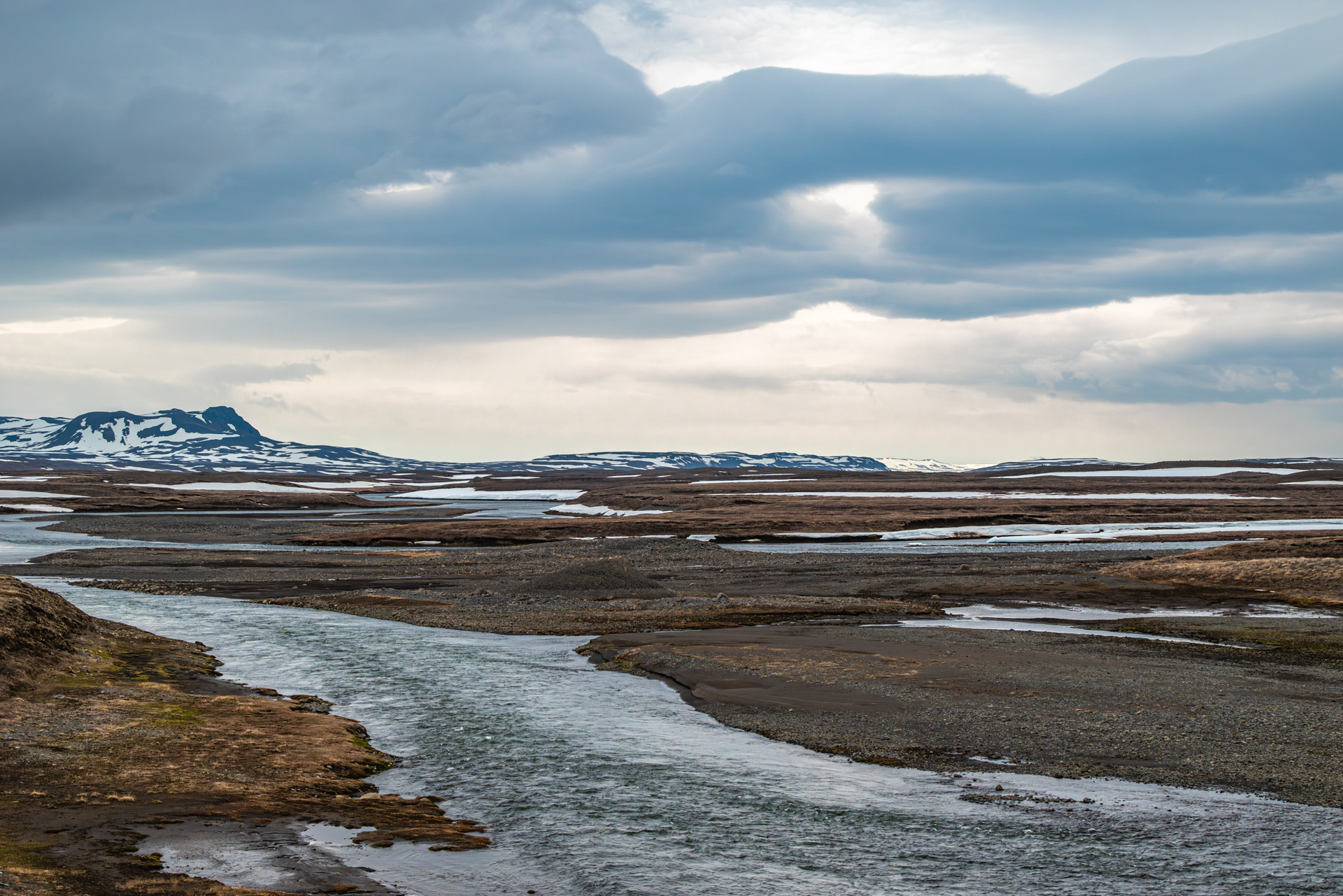 De weg 862 naar Dettifoss loopt langs een desolaat landschap met nog veel sneeuwresten.