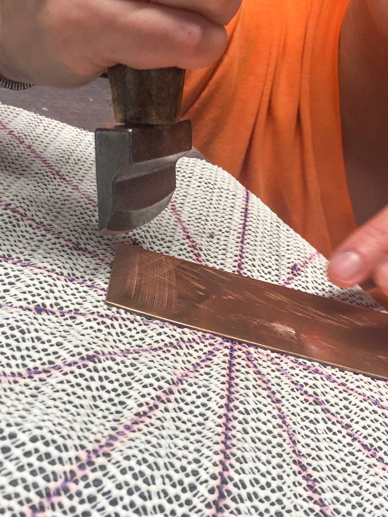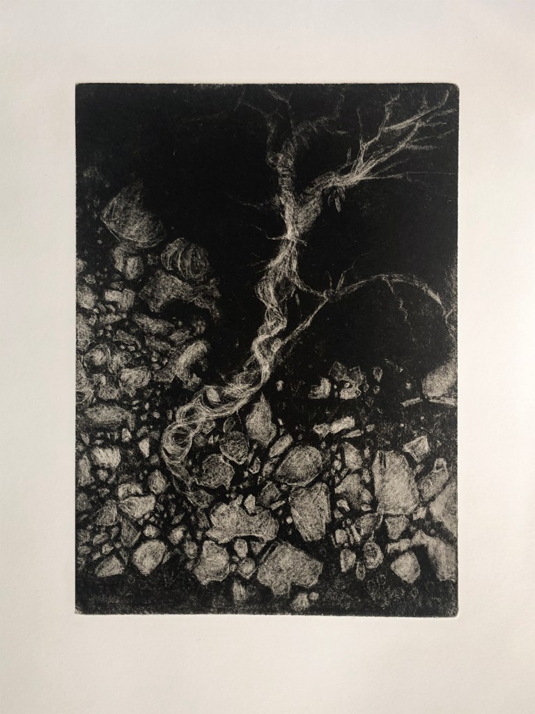Workshop bij Foundation Veerle Rooms, met 2 gastdocenten. Kennismaking met mezzotint. Dat is een techniek om sommige delen van je ets pikzwart te krijgen. Koperplaatje ongeveer 16×22 cm. Te groot om op 1 dag met een wiegijzer op te ruwen. Amai, mijn armspieren! Maar verder leuke ervaring! Volgende keer zal ik waarschijnlijk mijn ontwerp aanpassen zodat maar een deel van het werk zwart hoeft te worden, of het wiegen spreiden over 14 dagen…😜