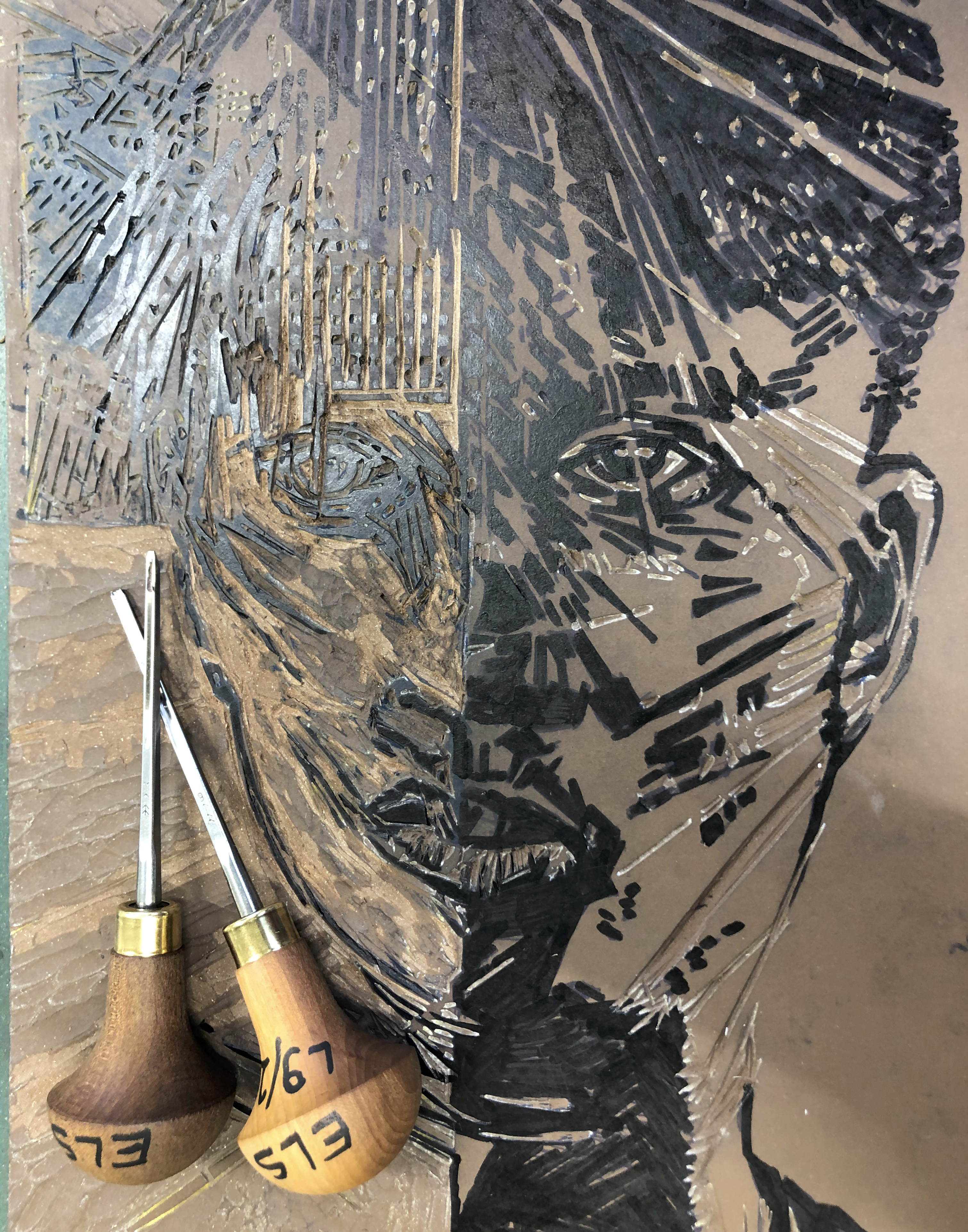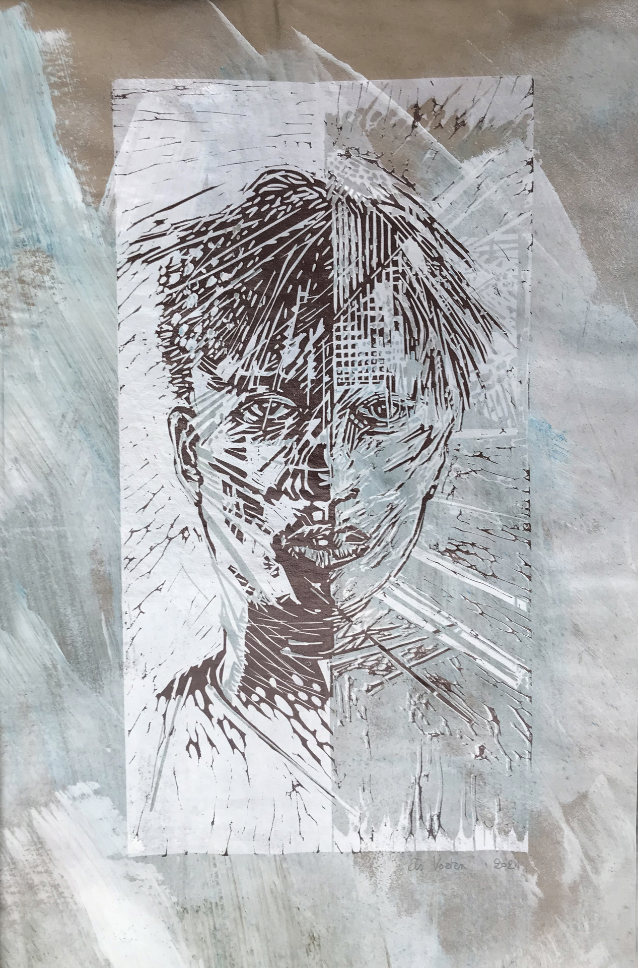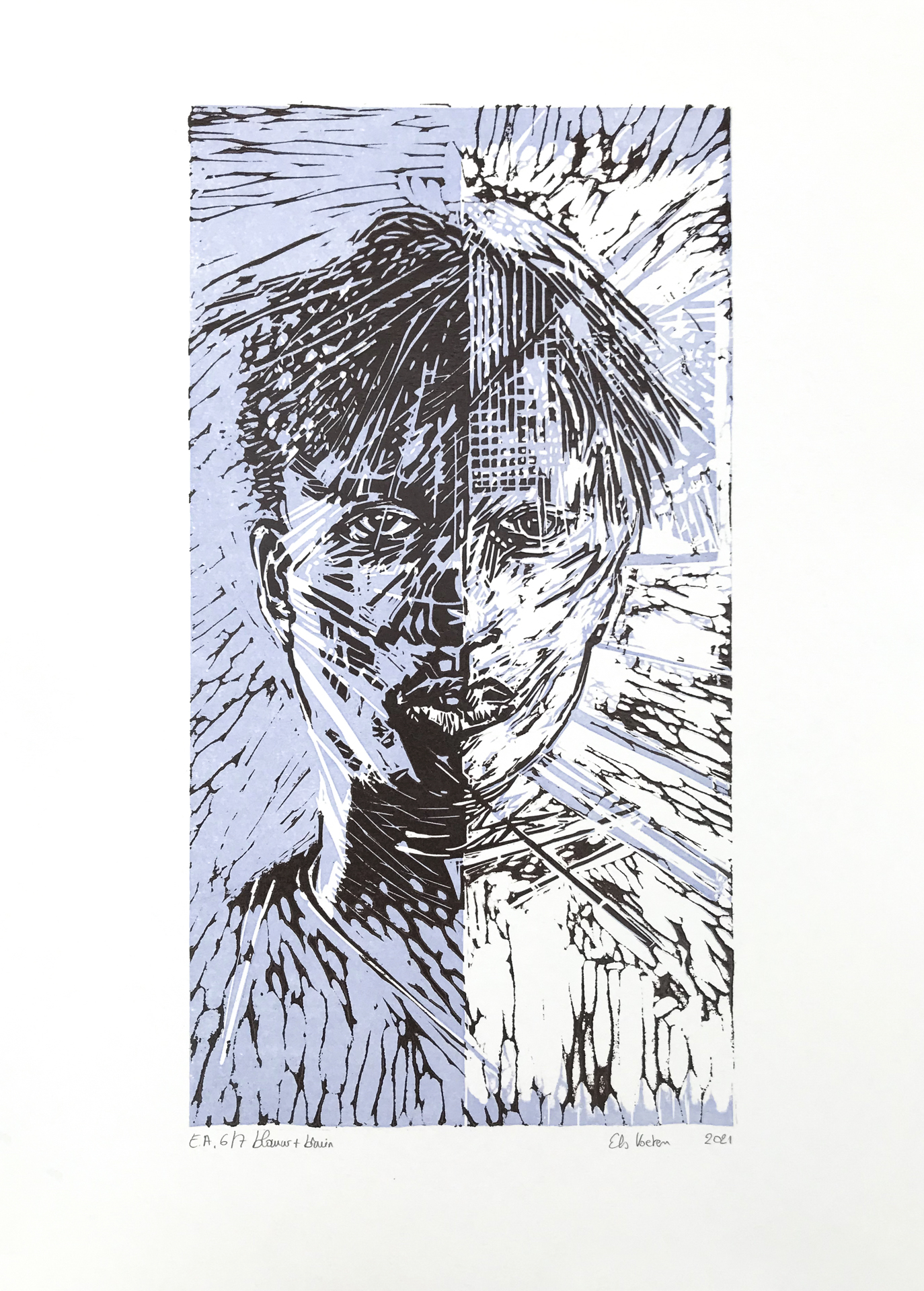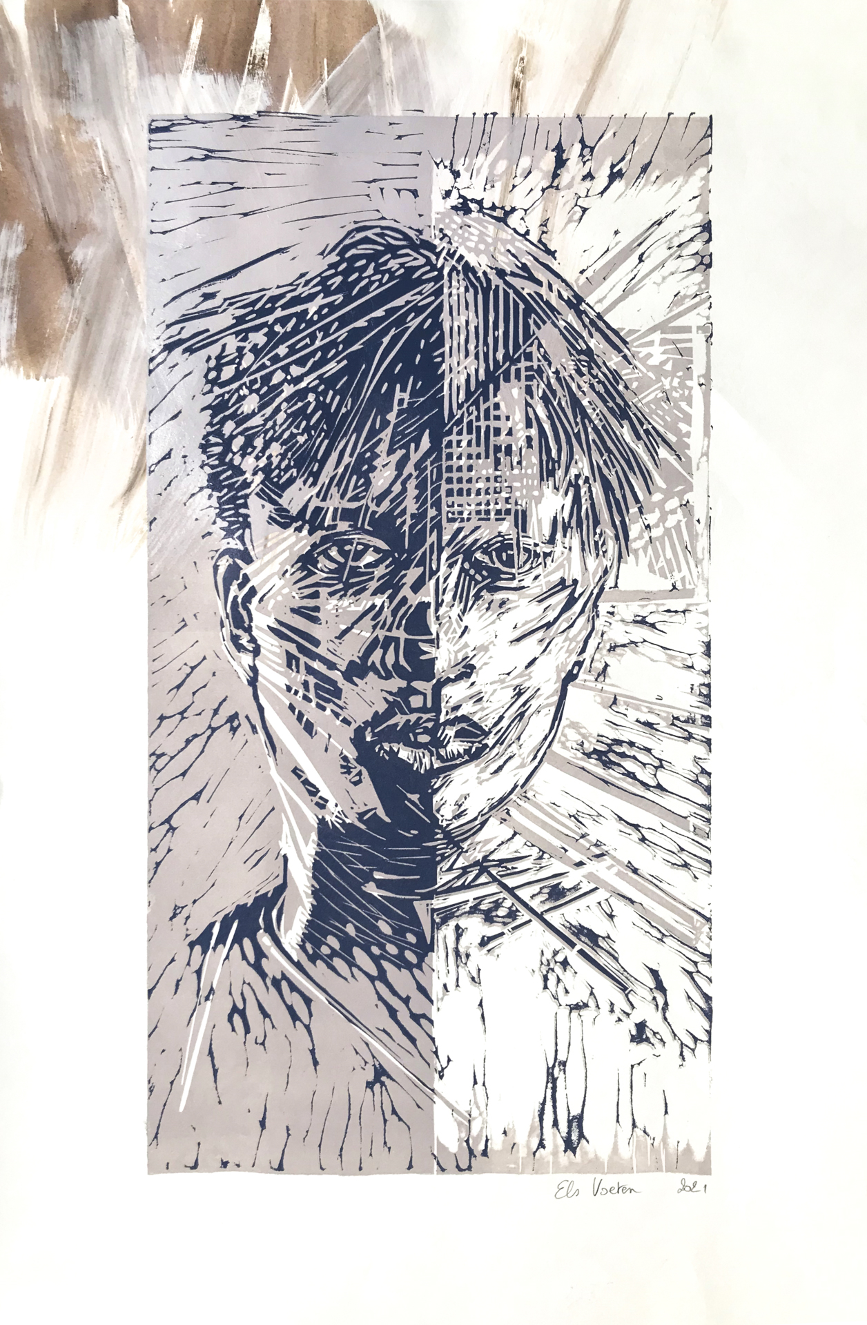 Portret in tweekleurendruk, in meerdere variaties, zowel in de inktkleuren als in de papierondergrond.