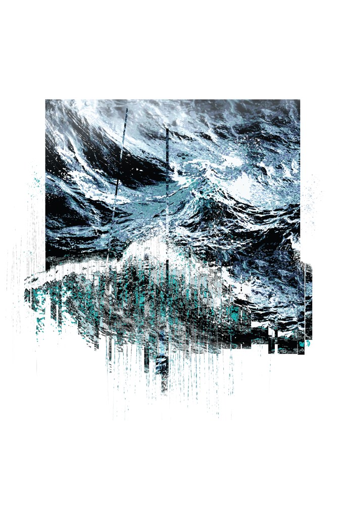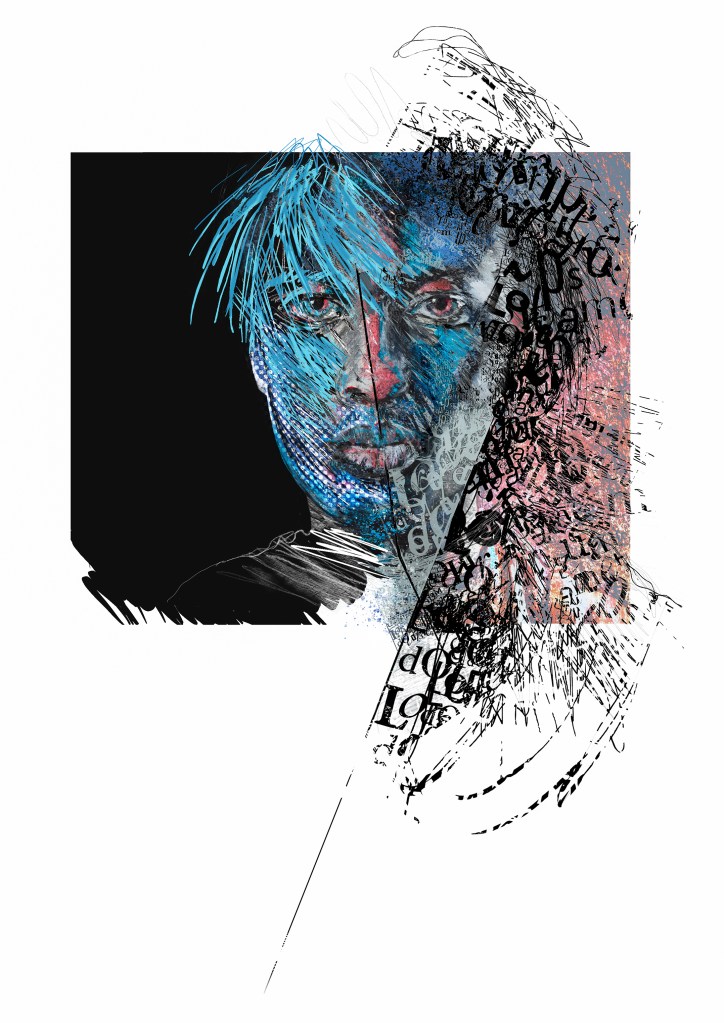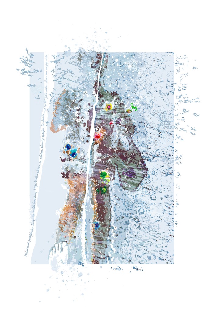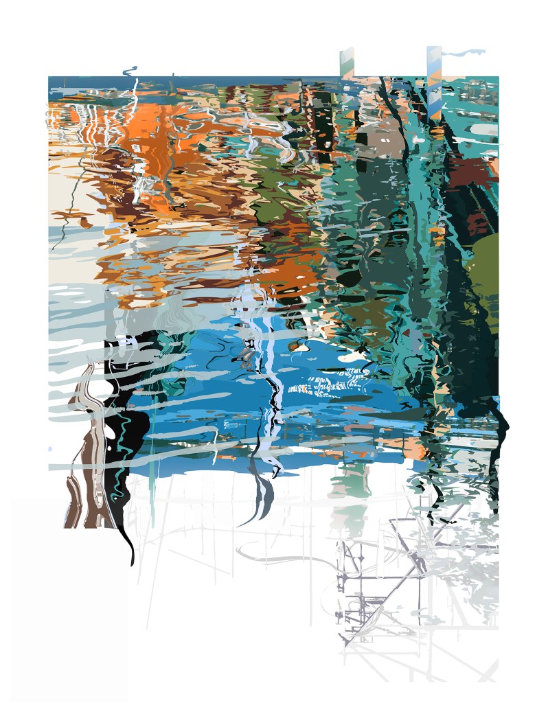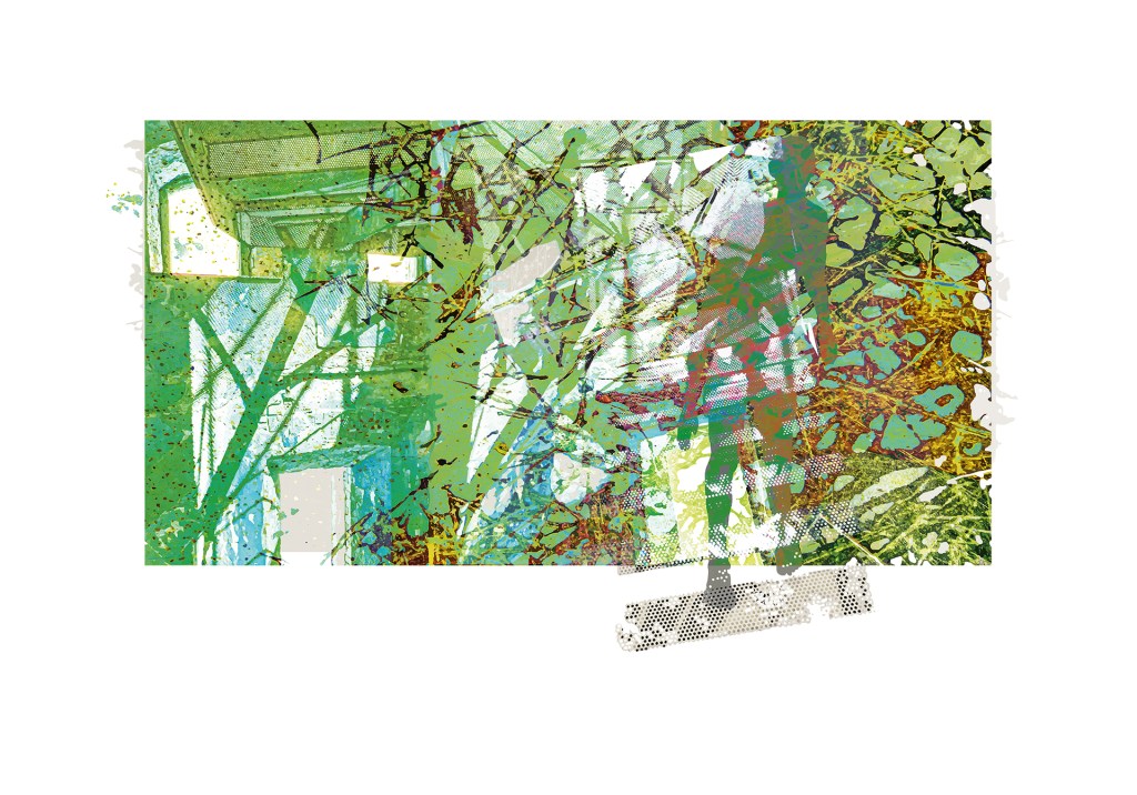 Een collage van fragmenten van verschillende (eigen) foto’s, omgezet naar tekeningen en bewerkt met fantasiepenselen en gommen, toevoegingen en weglatingen… lijnen, vlakken, structuren en texturen. De transformatie gaat ver, er is geen enkele foto in te herkennen, de sfeer telt.