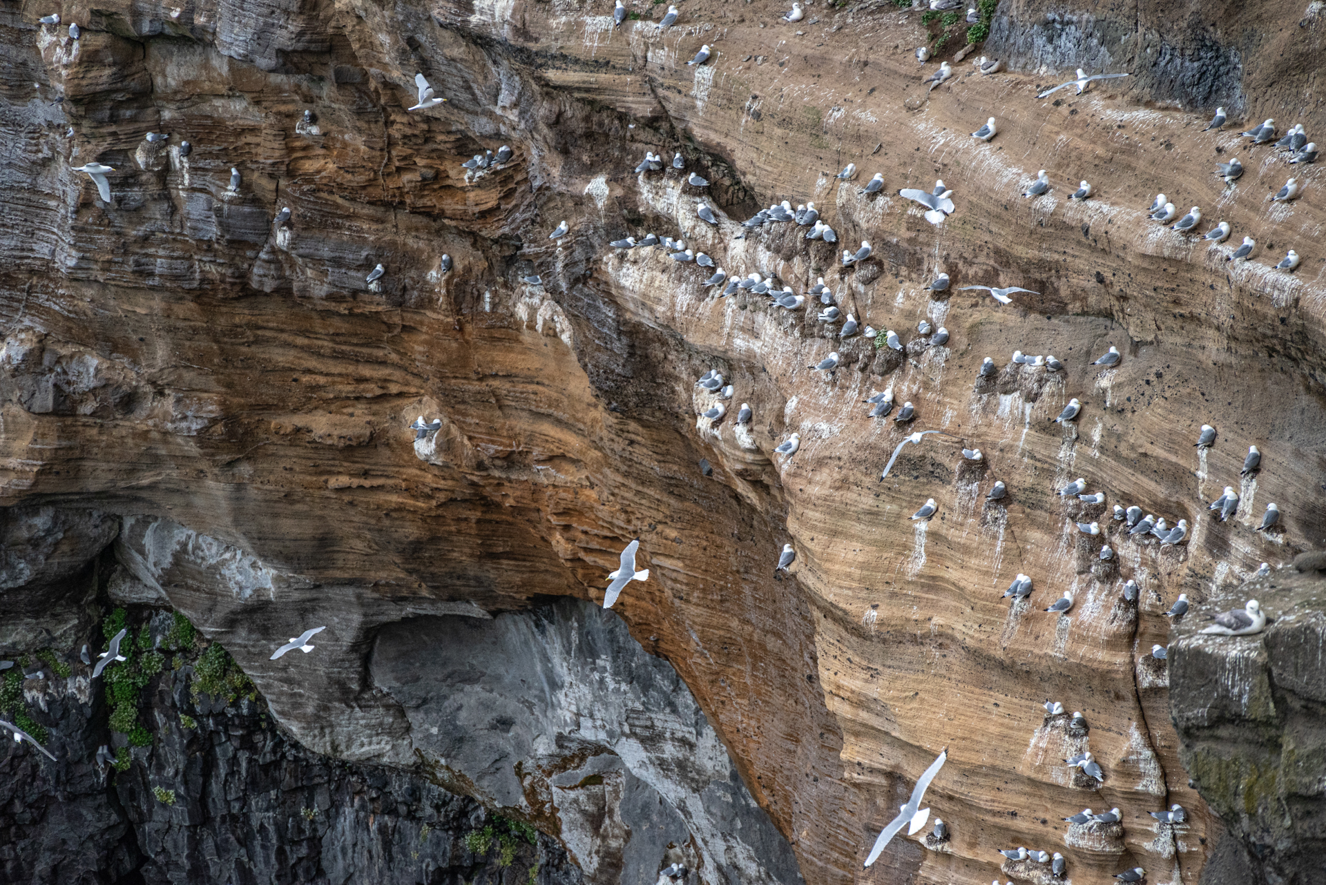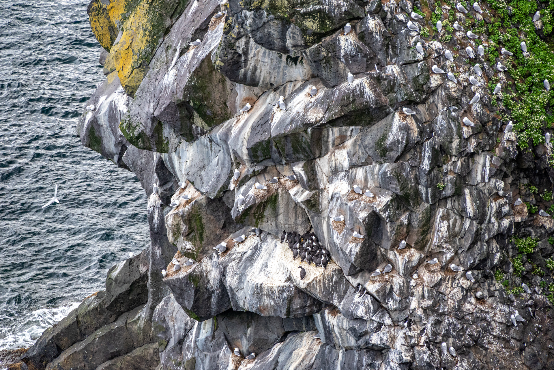 De uitwerpselen van de grote hoeveelheid vogels die er rusten en broeden, zorgen voor de witte kleur op de rots.