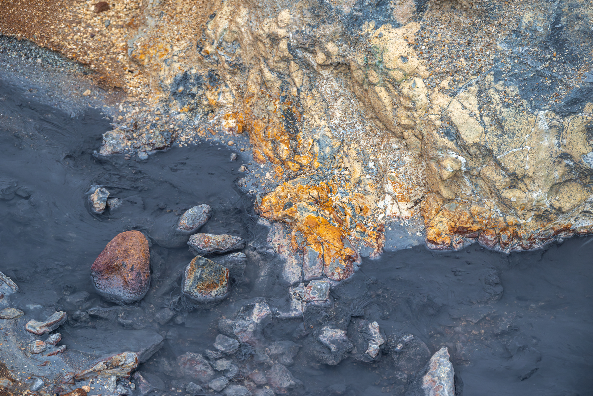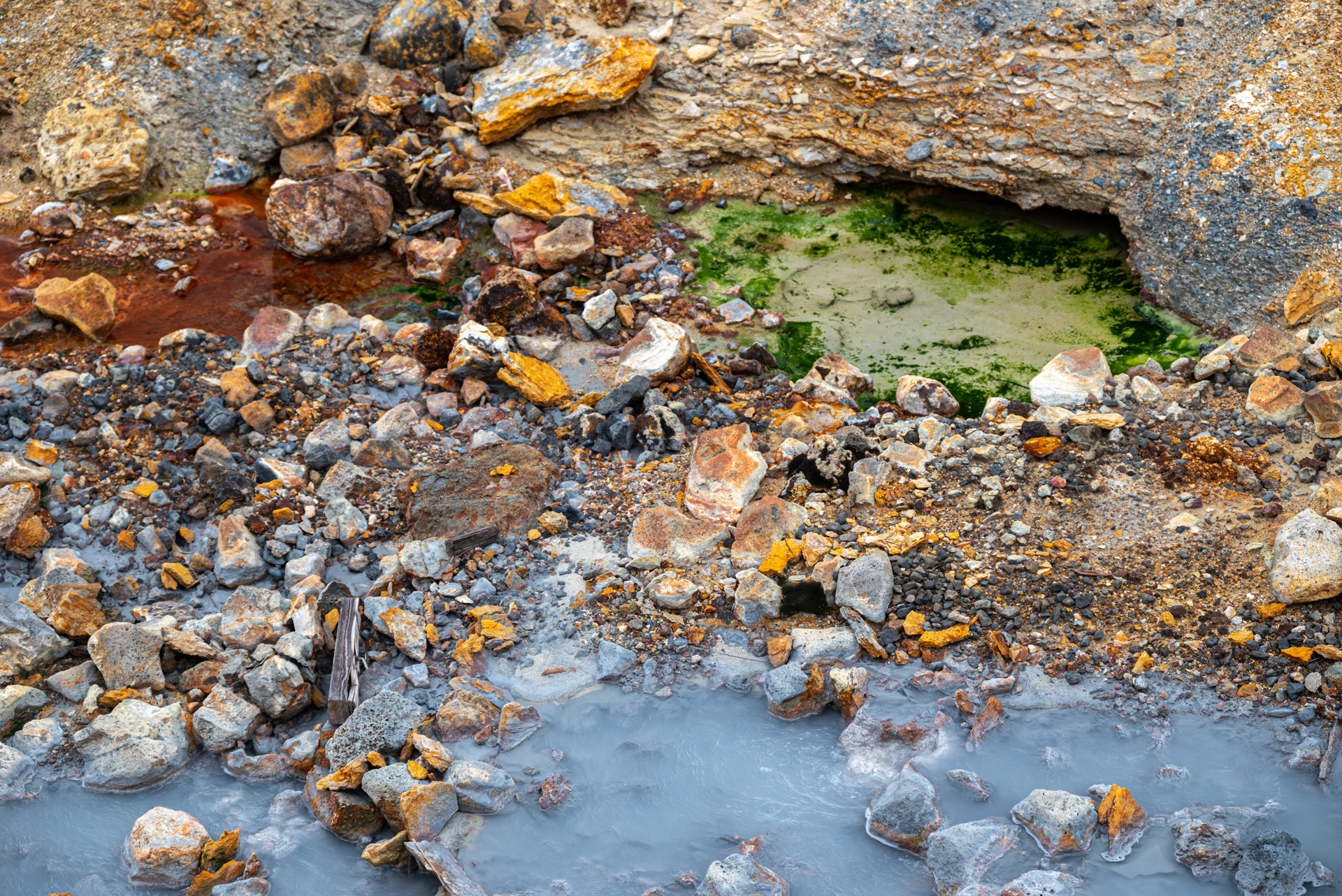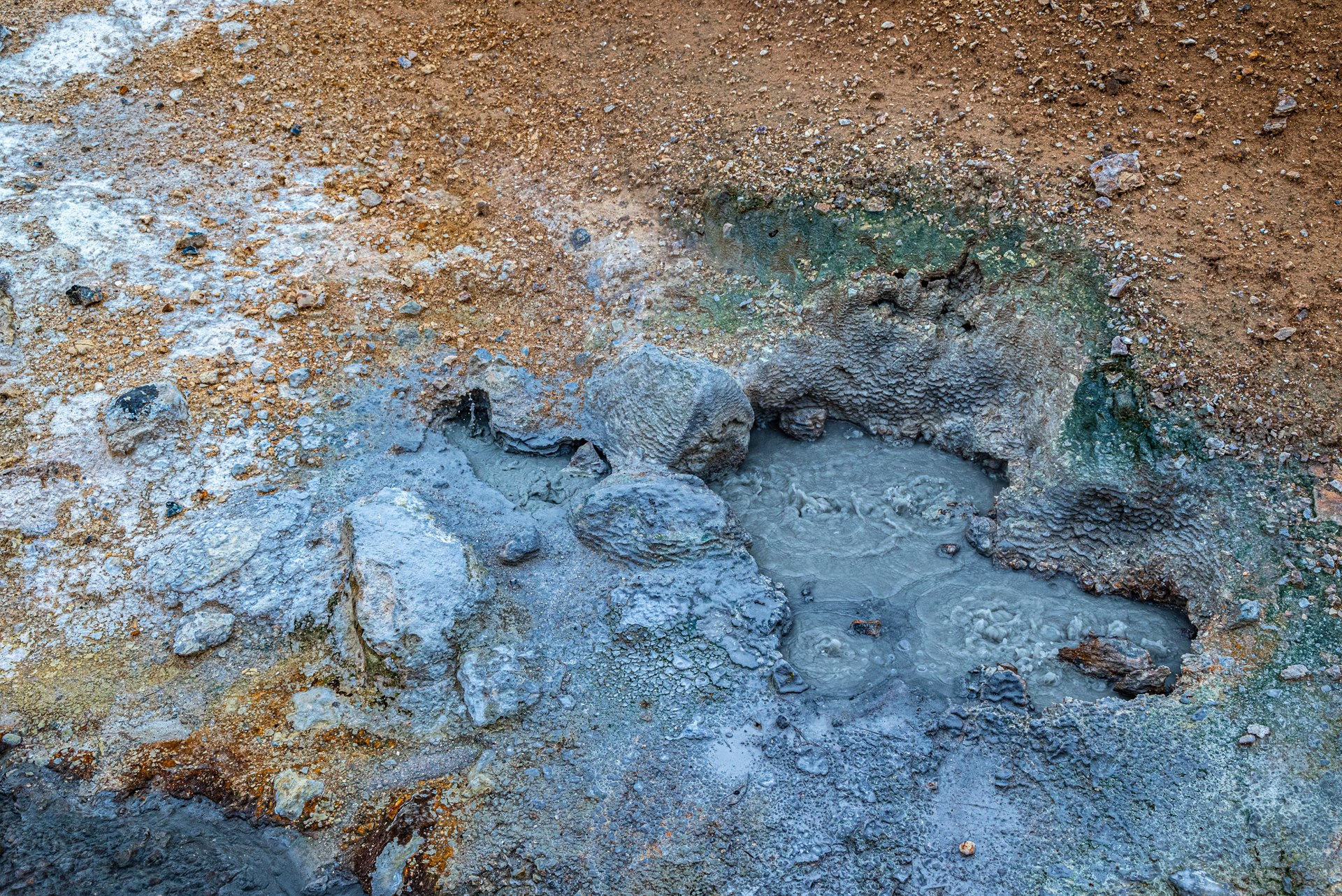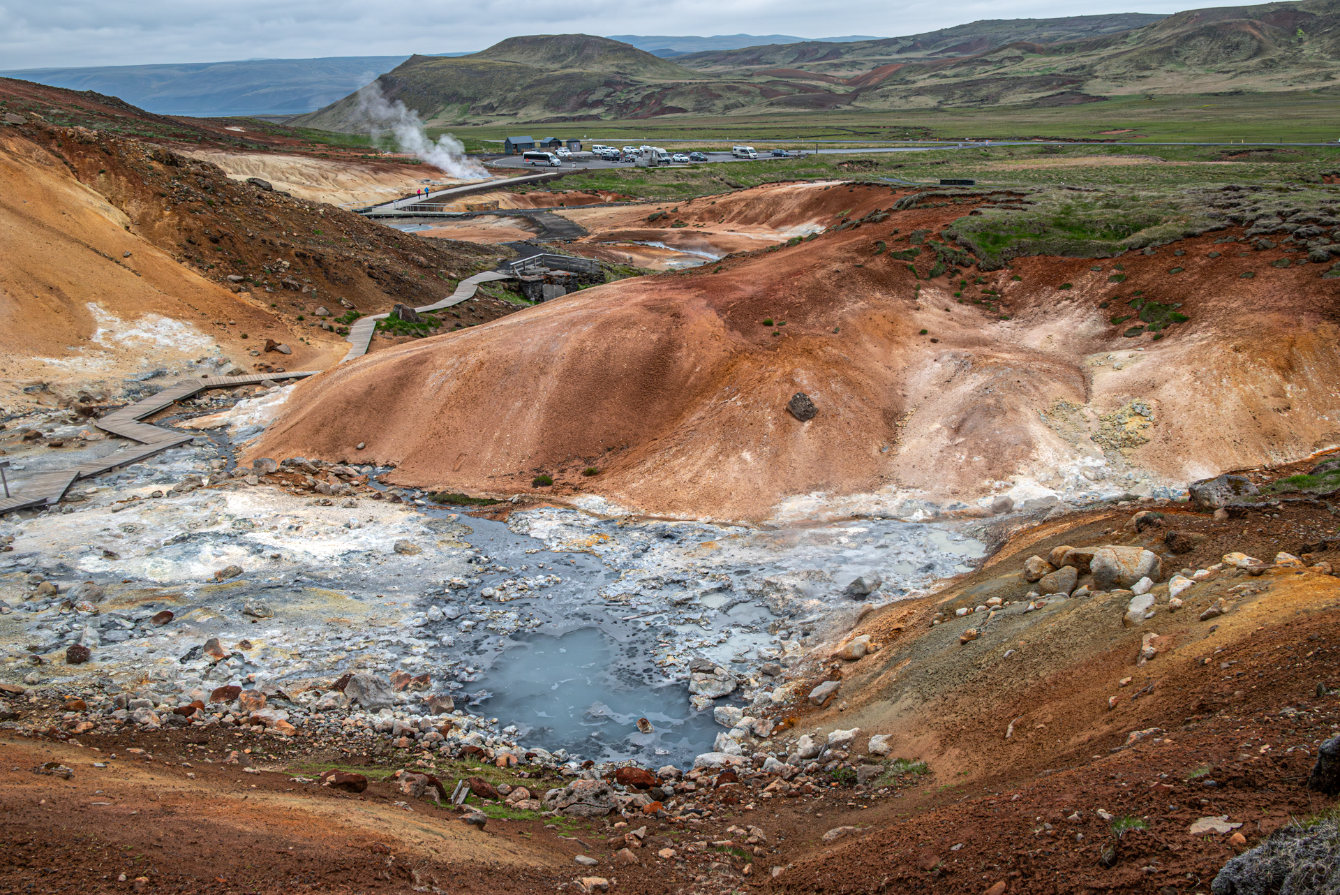 Tijdens een roadtrip door het land van vuur en ijs is het heel bijzonder om geothermische gebieden te bezoeken. Je ziet er pruttelende modderpoelen, stomend water en hoog dansende rookpluimen. In het zuidwesten van IJsland, op het schiereiland Reykjanes ligt Grindavik, intussen beroemd vanwege de recente vulkaanuitbarstingen. Waar de bewoners zelf geëvacueerd zijn mag je als toerist uiteraard niet komen. Tenzij je toevallig in de buurt bent op het moment van een uitbarsting, kan je niet veel meer zien dan zwarte lava. Maar een beetje verder is er ook nog het geothermische veld Krysuvik/Seltún. Dat is kleiner dan bv. Namaskard en ook op onze route. Namaskard was immers ondergesneeuwd (zie week 3).