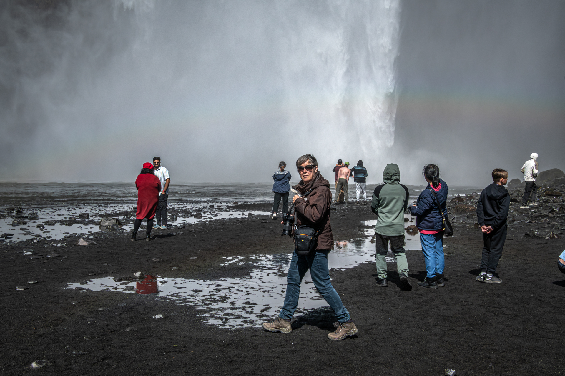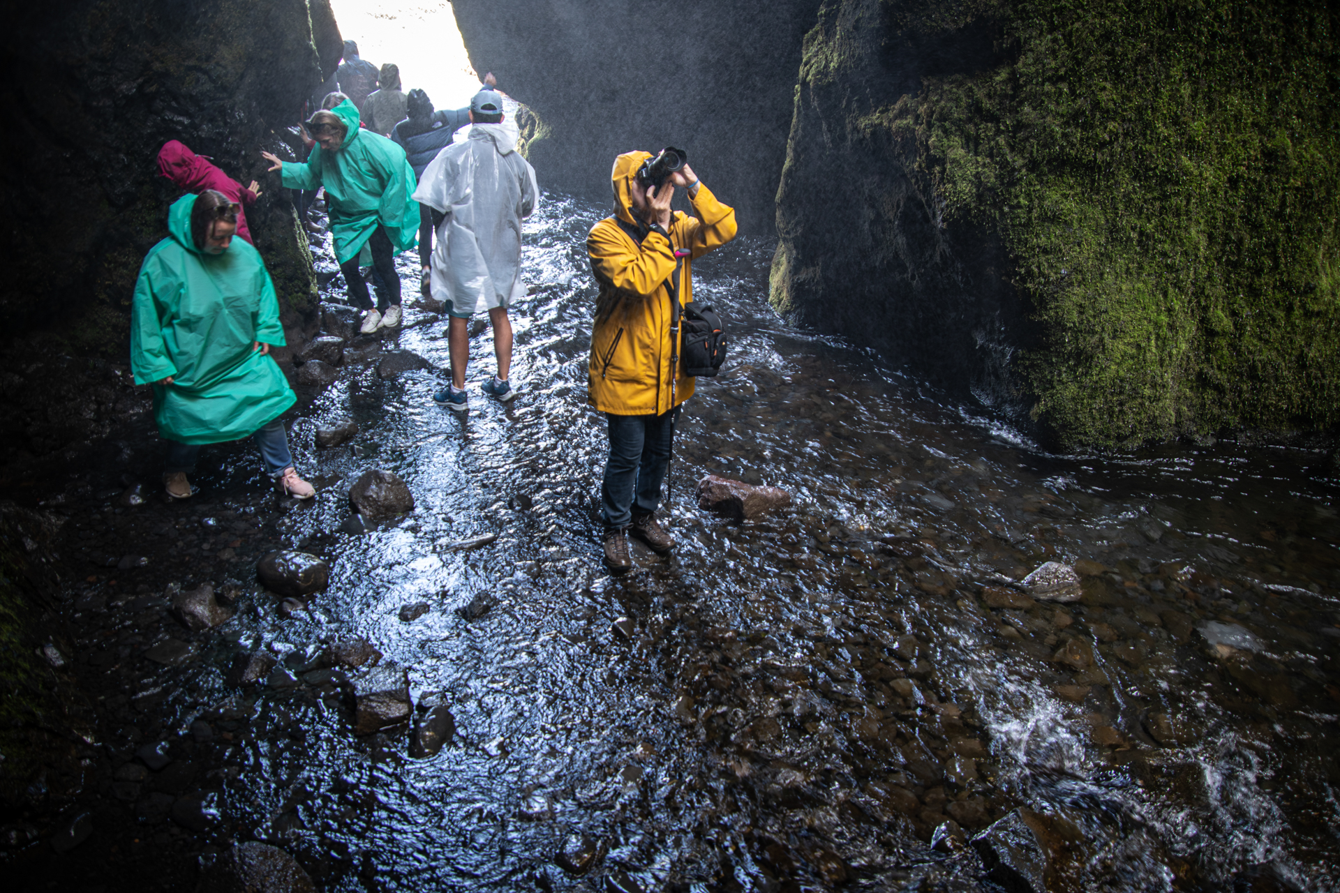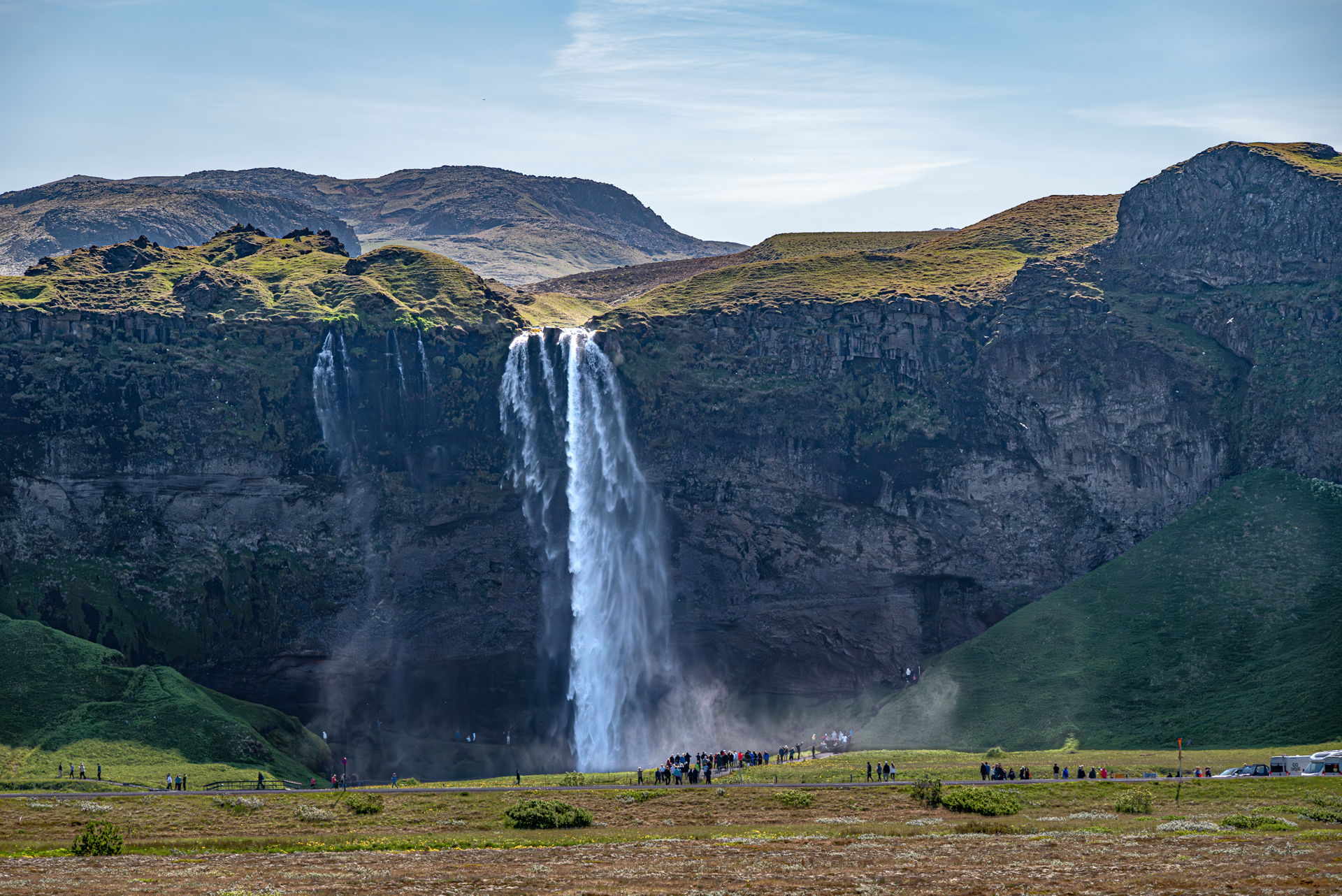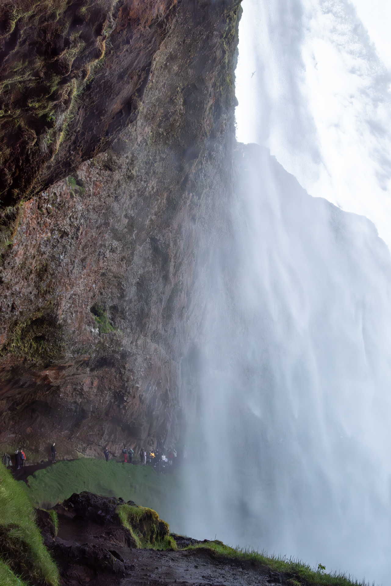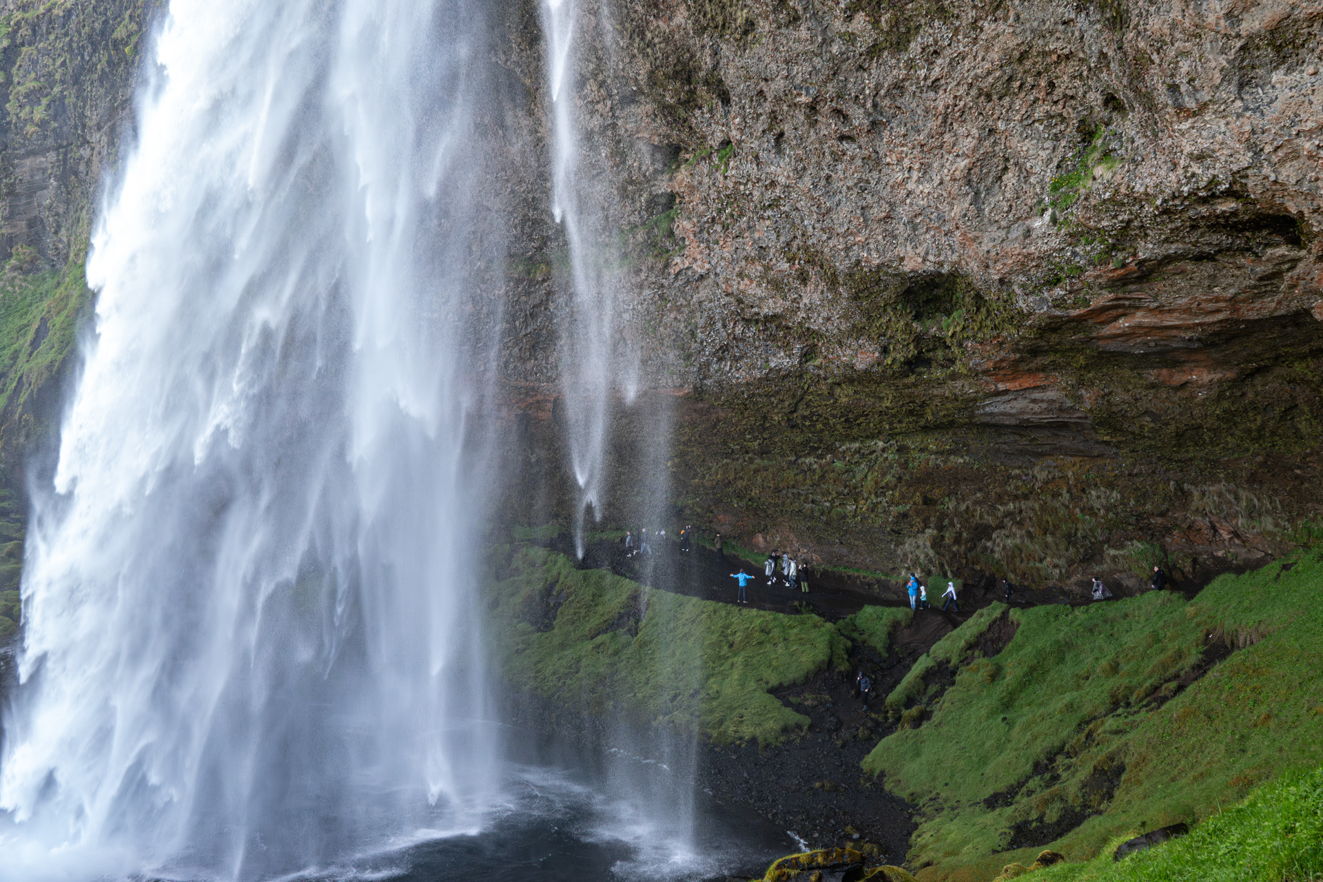Als we over de ringweg rijden, zien we van kilometers afstand al het water van een tafelberg naar beneden storten. We kijken naar Seljalandsfoss, samen met Skógafoss waarschijnlijk één van de bekendste watervallen in IJsland. En ja, die bekendheid zorgt voor veel drukte en toeristen bij de waterval. Het leuke aan de Seljalandsfoss is dat je over een glibberig paadje en natte rotsen achter de 65 meter hoge waterval door kunt lopen.