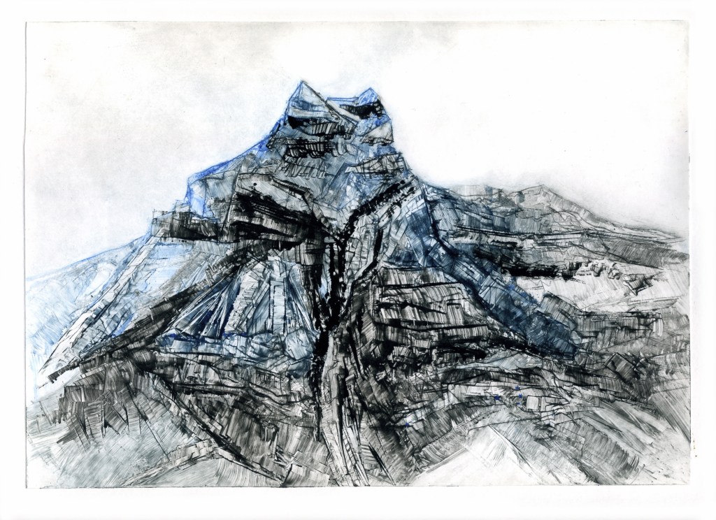 Droge-naald-ets met losse inkt er overheen (als een monotype),